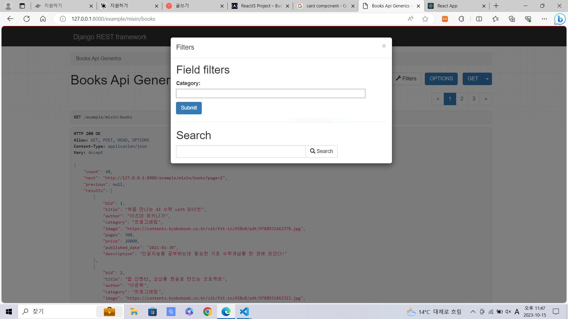 백엔드 Django rest framework에서 분야별 카테고리, 검색 필터링을 만들어 주었다.