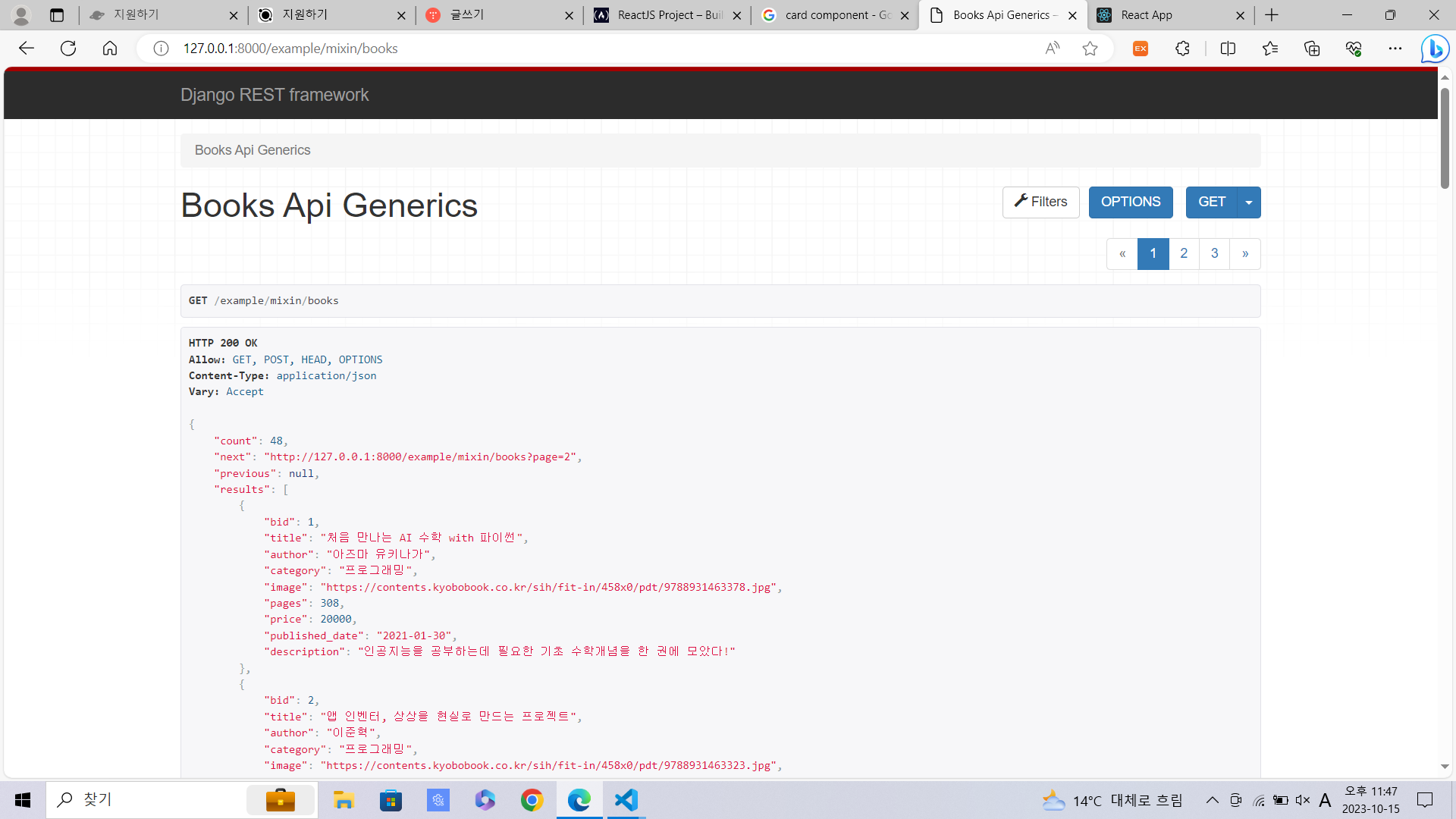 백엔드 Django rest framework + 프론트 React.js 그리고 디자인은 부트스트랩5를 사용하여 서점 사이트를 구현해 보았다.