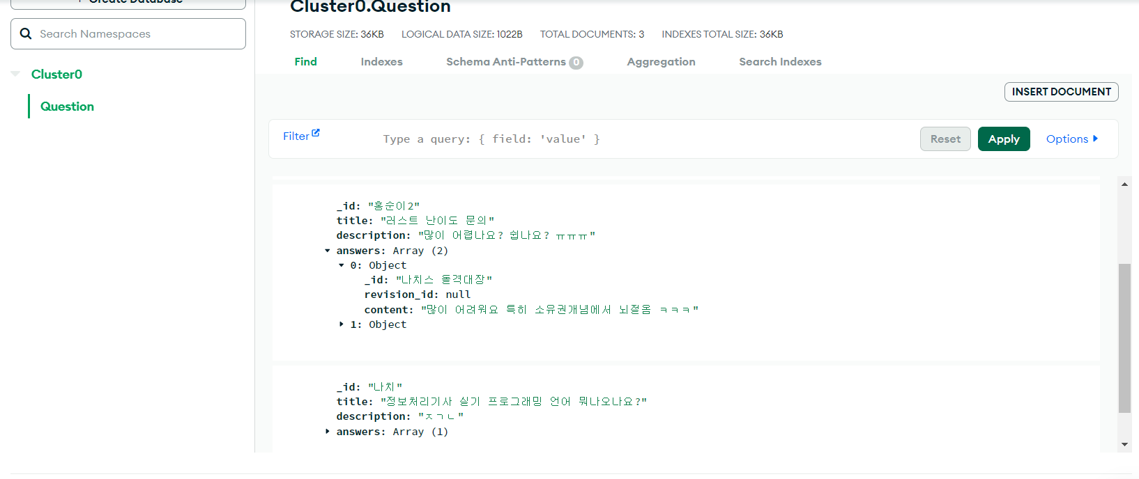 3. 질문문서 answers필드에 답변모델을 참조되고 있으니 처음에 질문문서를 조회하고 질문 내의 답변 목록에서 수정하려는 답변을 찾는다 마지막으로 질문문서에 수정한 답변을 save시켜 업데이트에 반영한다.