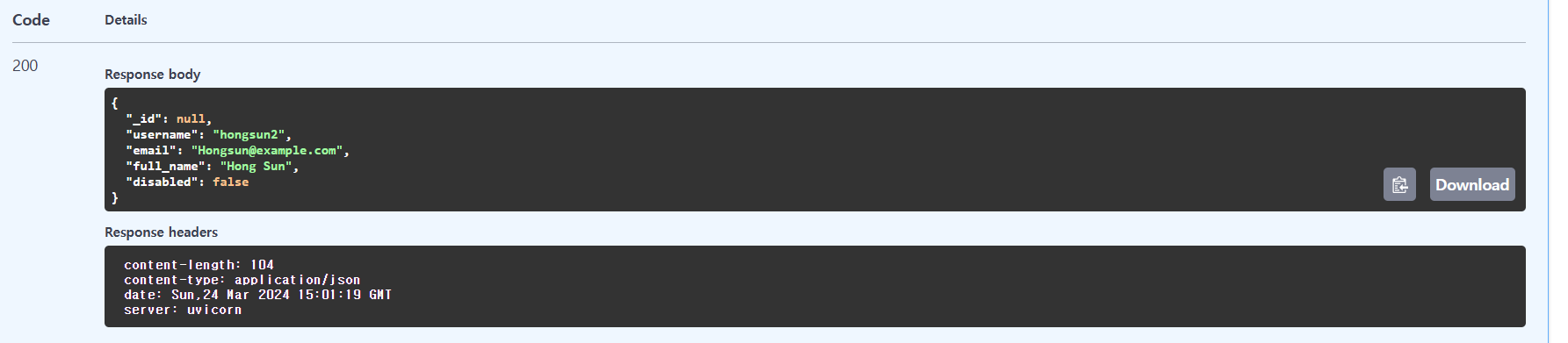 임시 가짜 데이터베이스안에는 인증이 완료된 username과 hased_password 키값이 존재한다. 그리고 disabled가 활성화 되어있다.