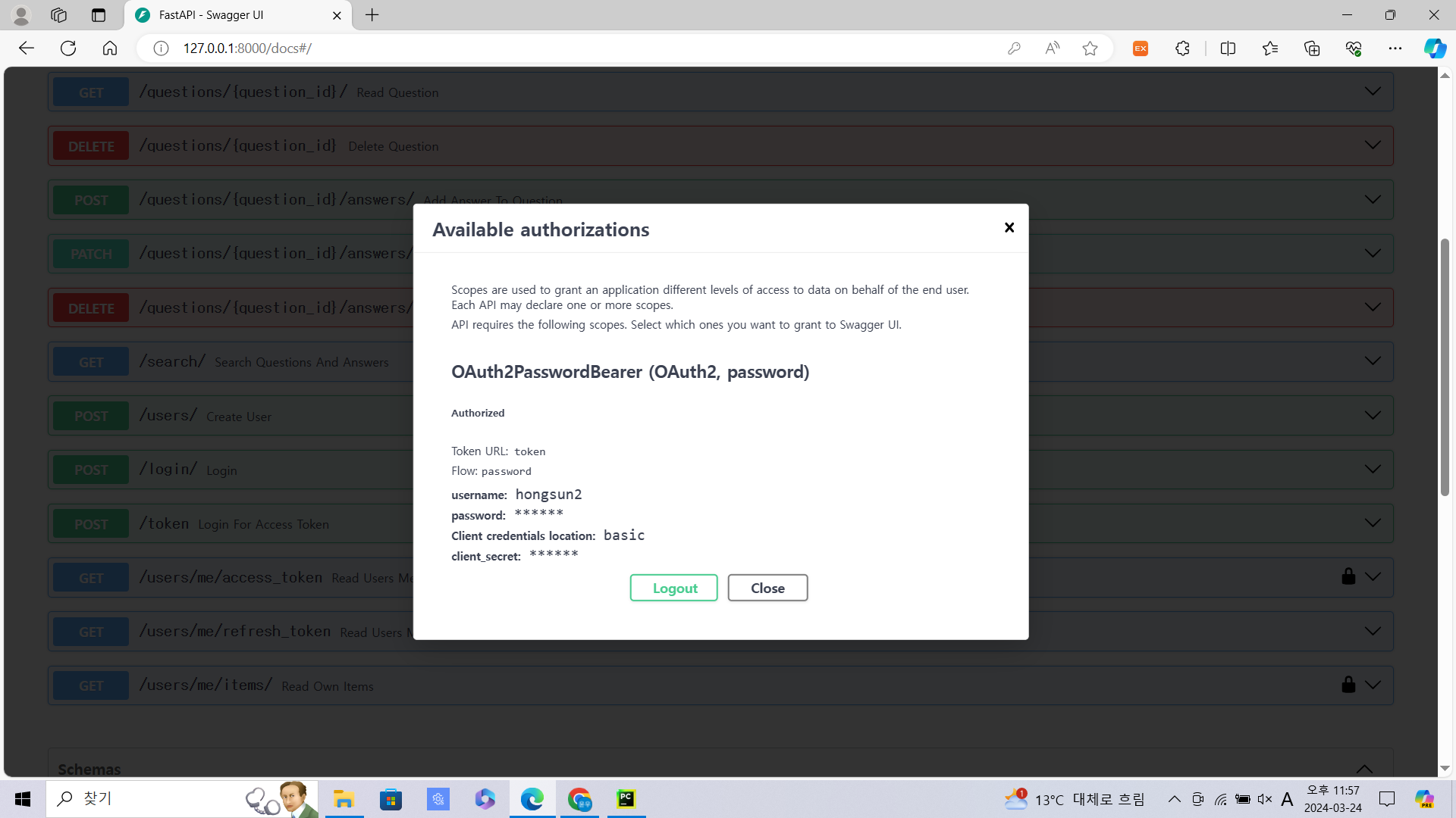 그러므로 oauth2인증에 성공하면 임시 가짜 데이터베이스가 출력되서 보여준다 UserInfo 응답 모델은 fake_users_db 이다. 엑세스 토큰에 유효기간은 1분이라 1분만 보여준다.